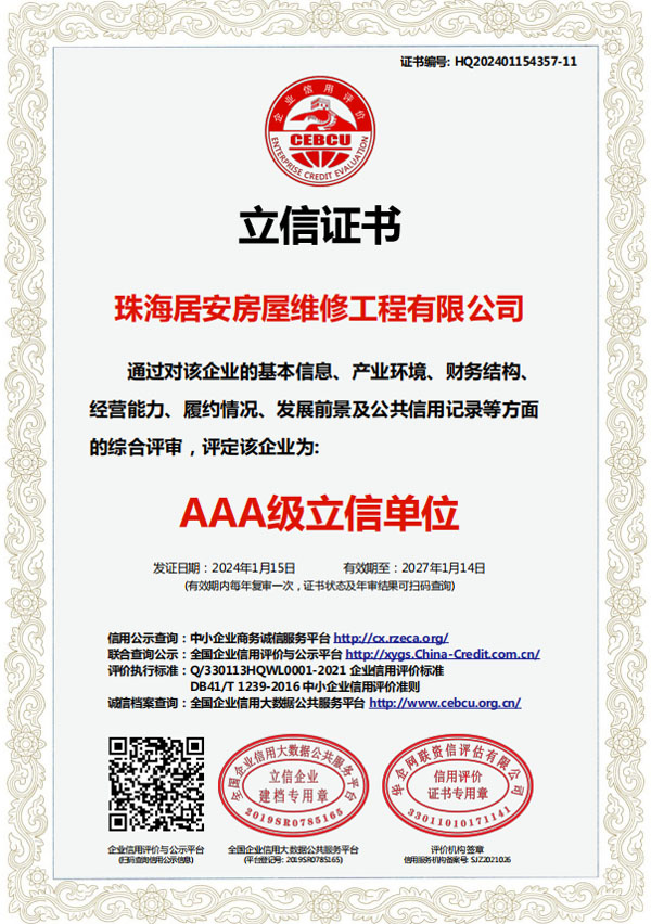 珠海居安房屋維修工程有限公司成立于2020年,是一家專注房屋維修的公司。我們擁有各類型專業人才,業務包括老舊建筑翻新改造、外墻空鼓修復、防水幕墻養護、外墻預置構件拆除更換、供排水管網改造、墻面翻新、鋼制結構建筑構建及折除,外墻清洗及裝修裝飾。